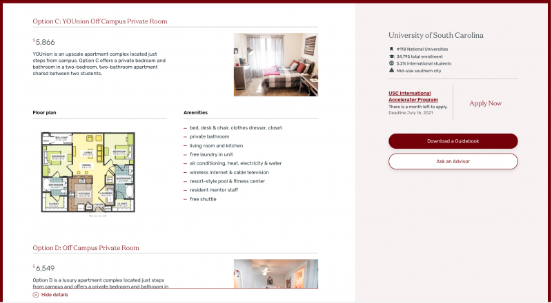 Colleges offer certain housing options to certain students — freshman only vs graduate level and the like. Our students need to know that so our system needed to know that, while selling the campus and clarify top questions. Crafted uniform dorm and apartment deions and amenities (because international students want to know whether they have to bring sheets or buy a coffee maker).